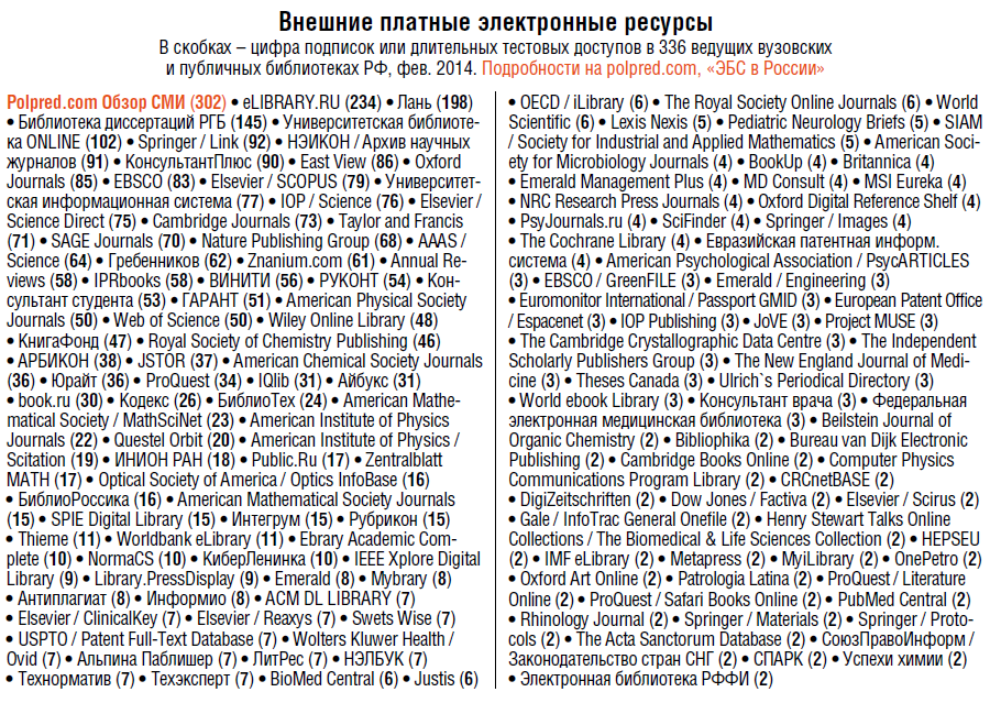 Polpred дает оценку рынка электронных баз данных для целей образования и науки. Мы опубликовали результаты просмотра в фев. 2014 г. тысячи главных библиотечных сайтов РФ — как они сами объявили о подписке или длительном тестовом доступе. 336 библиотек вошли в рейтинг, с 1-м местом у СПБ гос. ун-та (74 ресурса в доступе) и 334-м у Парламентской б-ки ФС РФ (2 ресурса).
